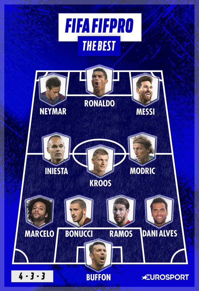 Buffon; Dani Alves, Sergio Ramos, Leonardo Bonucci, Marcelo; Luka Modric, Toni Kroos, Andrés Iniesta; Lionel Messi, Cristiano Ronaldo, Neymar.