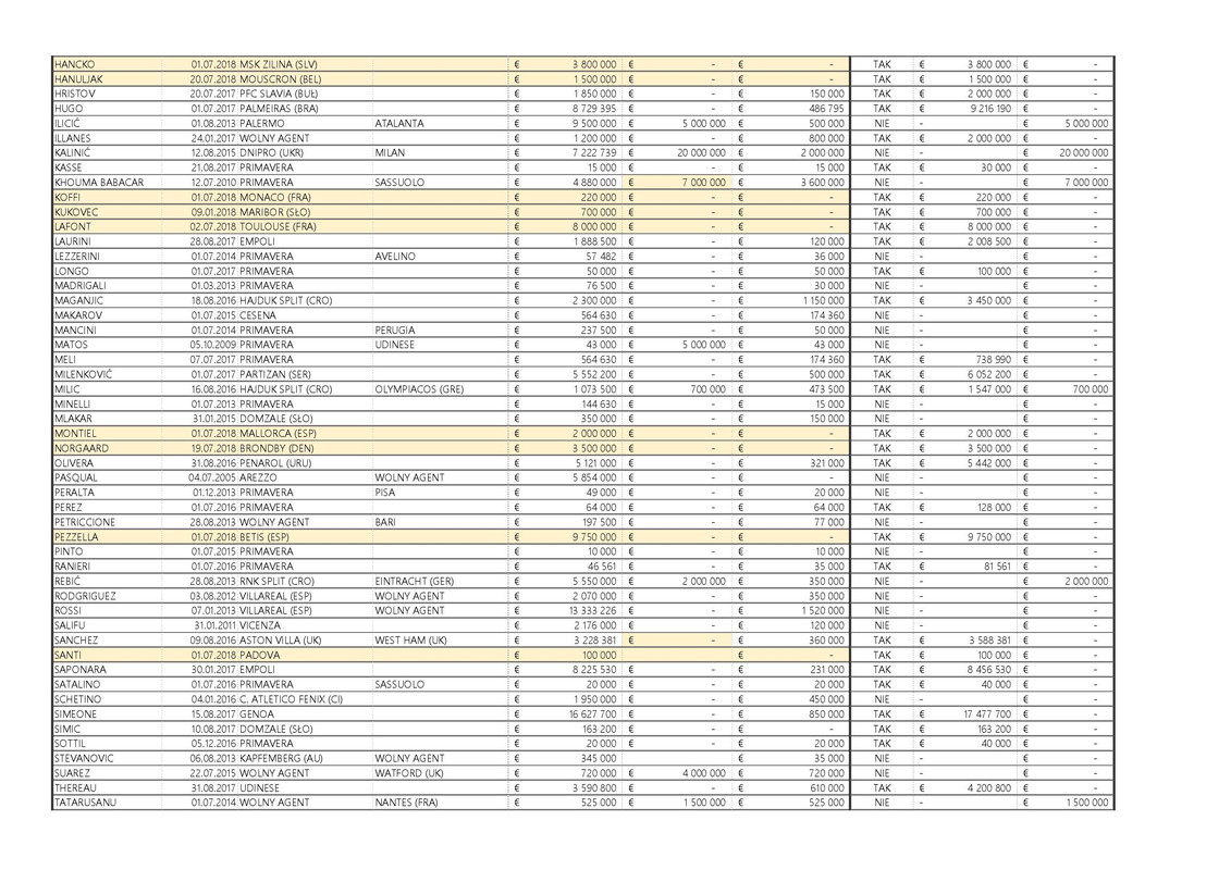 Naliczyłem około 76mln, moim zdaniem nietrafionych transferów (Benassi 10,9mln, Cristoforo 3,7mln, Diks 3mln, Hugo 9,2mln, Eysseric 4,5mln, Laurini 2mln, Norgaard 3,5mln, Olivera 5,4mln, Sanchez 3,6mln, Saponara 8,5*, Simeone 17,5mln, Thereau 4,2mln).