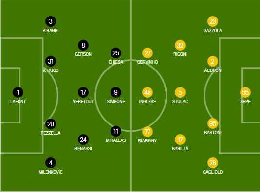 25' Doppio fallo su Chiesa da parte prima di Biabiany e poi Gagliolo, punizione dalla trequarti destra per la Fiorentina: Veretout calcia perfettamente in mezzo: mischia furibonda, Pezzella non riesce a colpire di testa, poi Simeone due volte viene rimpallato a pochi passi dalla porta