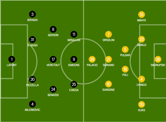 18' Doppia grandissima occasione per la Fiorentina, Skorupski esce male su un angolo, prima Dabo tenta un missile parato dal polacco, poi Chiesa e Veretout si vedono ribattere la conclusione