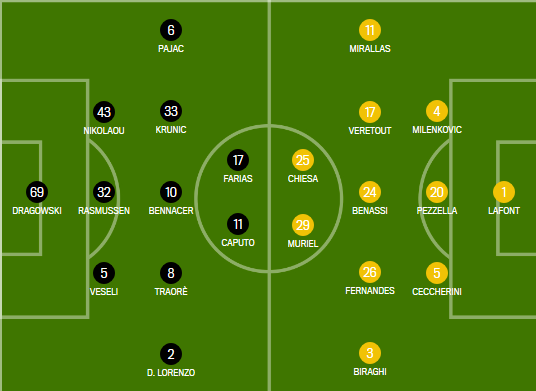 Fiorentina: Lafont - Milenković, V. Hugo, Pezzella (c, 86' Gerson), Biraghi - Veretout, Benassi, Edimilson - Muriel (67' Vlahović, Simeone, Mirallas (60' Chiesa). A disp.: Terracciano, Brancolini, Ceccherini, Laurini, Hancko, Nørgaard, Dabo, Beloko, Montiel. All.: Vincenzo Montella