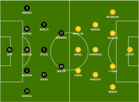 Fiorentina: Lafont - Milenković, V. Hugo, Ceccherini, Biraghi - Benassi, Veretout, Gerson - Mirallas (28' Dabo-84' Vlahović), Simeone (69' Muriel), Chiesa (c). A disp.: Terracciano, Brancolini, Pezzella, Hancko, Antzoulas, Ferrarini, Nørgaard, Edimilson, Montiel. All.: Vincenzo Montella